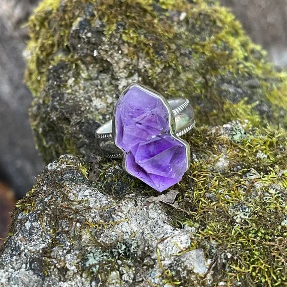 This ring is lovingly crafted from sterling silver featuring an Amethyst double point and is finished to a soft shiny polish.